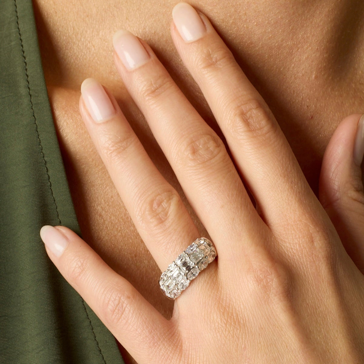 18KW Three Row Oval and Emerald Cut Diamond Band