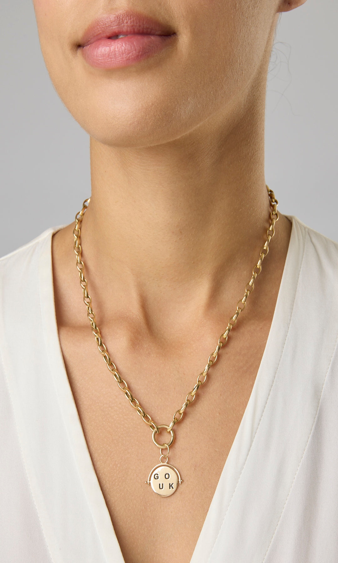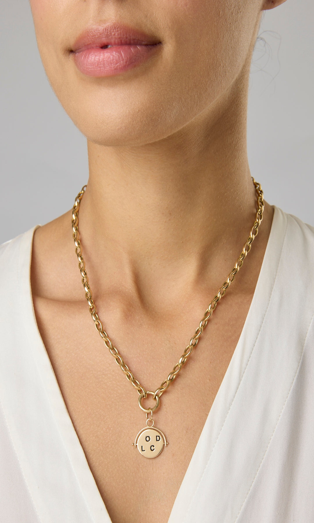 The Good Luck Spinner Charm flips to reveal engraved block letters, spelling “GOOD LUCK” in sequence as it turns from side to side. Its polished surface and balanced proportions create a sleek silhouette with a subtle interactive detail. Designed to be worn on a chain or bracelet, it offers a refined way to carry a timeless sentiment of fortune and well-being.