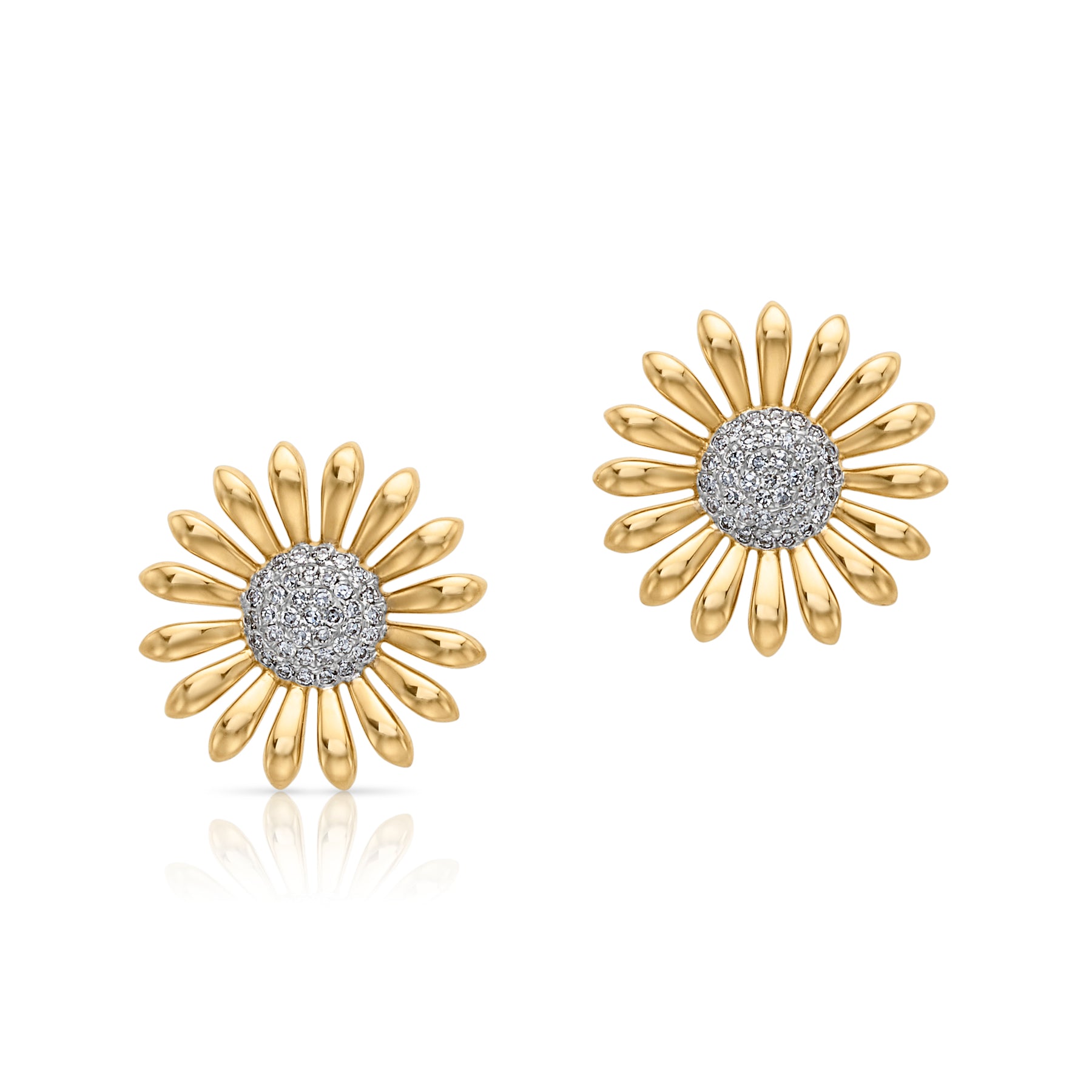 These 14K yellow gold earrings feature polished gold petals surrounding a pavé diamond center. The high-shine petals create contrast against the diamond-set core, giving the earrings depth and texture. They offer a bright and cheerful interpretation of a classic floral motif.