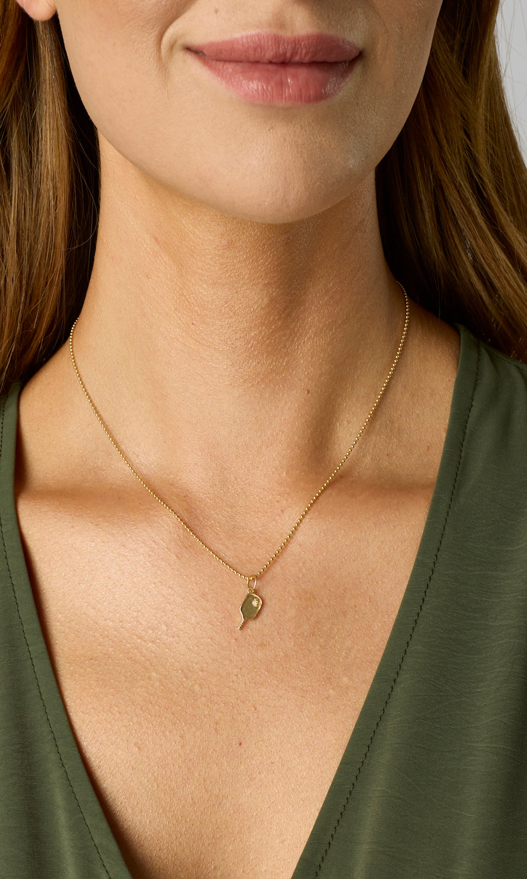 This 14K yellow gold pickleball paddle charm brings a playful twist to fine jewelry. A tiny diamond-studded pickleball glimmers near the top, ready for the perfect serve. With its polished finish and detailed handle, it’s a lighthearted nod to the game you love.