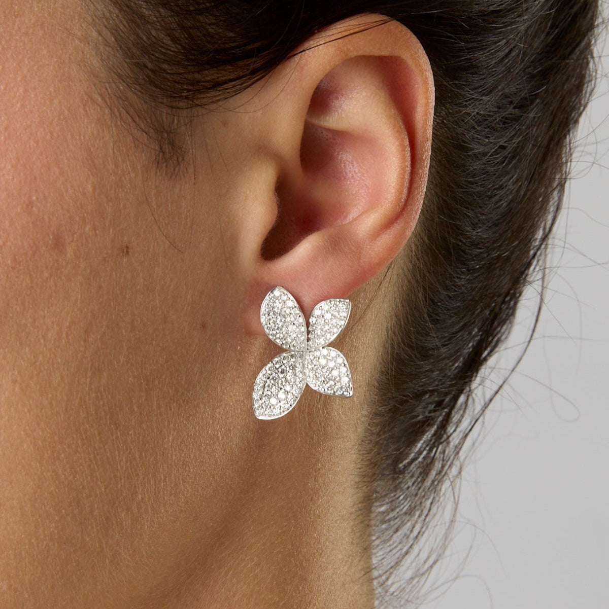 14K white gold stud earrings with diamond halo. The diamond halo adds an elegant touch to your style, making you stand out in a crowd.