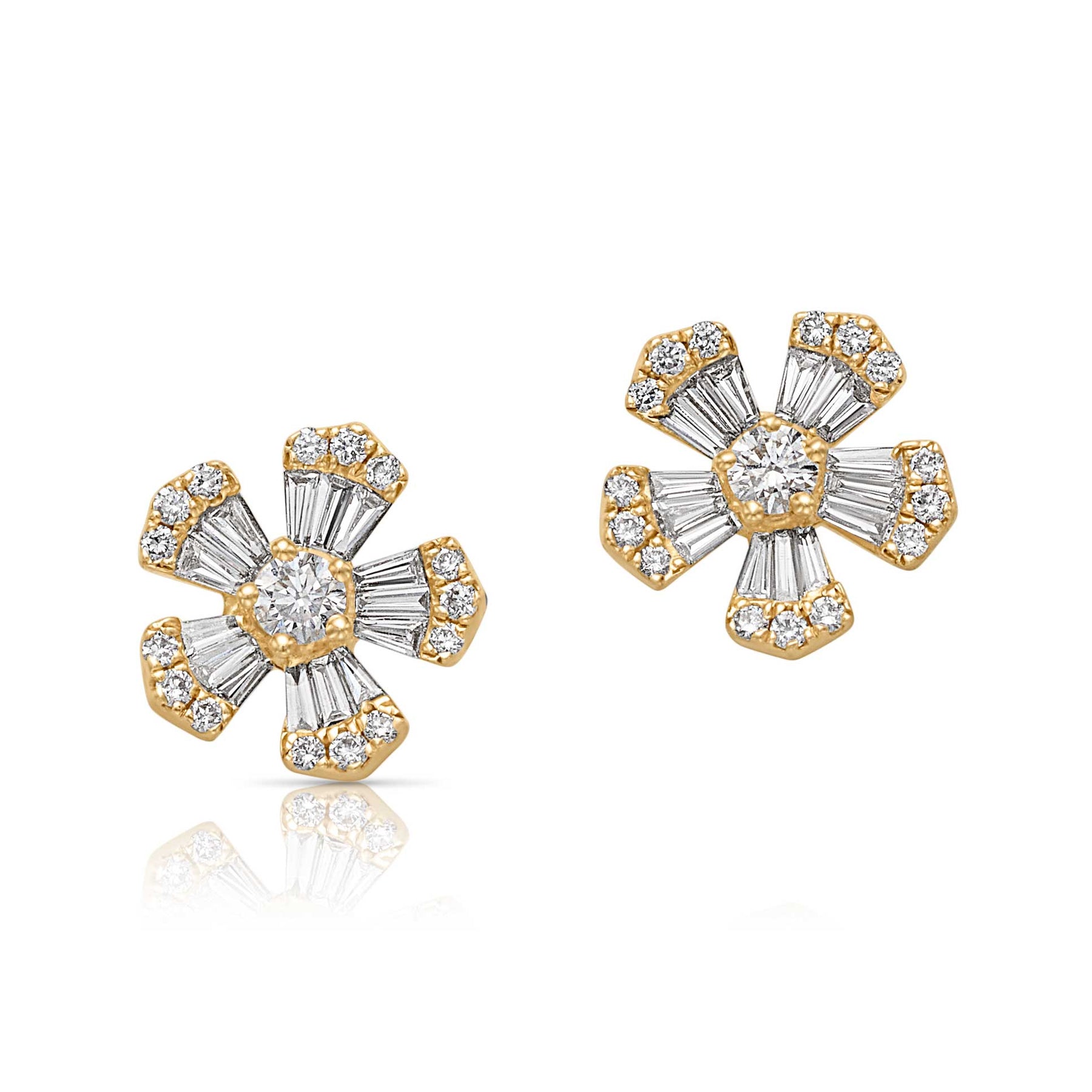 These yellow gold stud earrings are designed in the shape of a flower, featuring a round diamond center surrounded by tapered baguette diamond petals. Each diamond is set to capture and reflect light from every angle, creating a refined, symmetrical look.