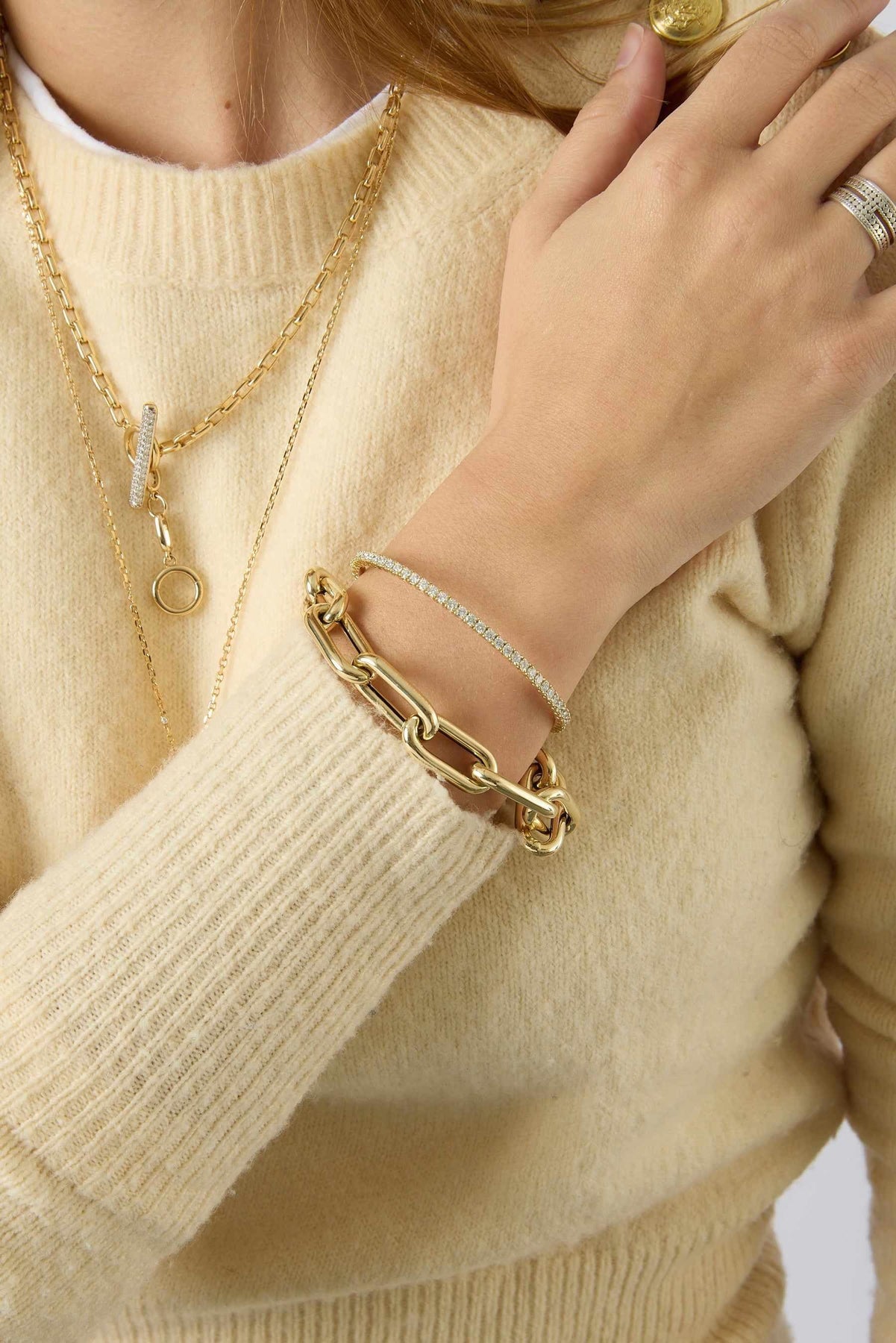 A diamond bracelet that doesn't compromise sparkle, shine, or security. Our flexible diamond bracelet made of 14K yellow gold is sure to be your jewelry box's next showstopping piece. The flex closure allows for easy and secure wear.