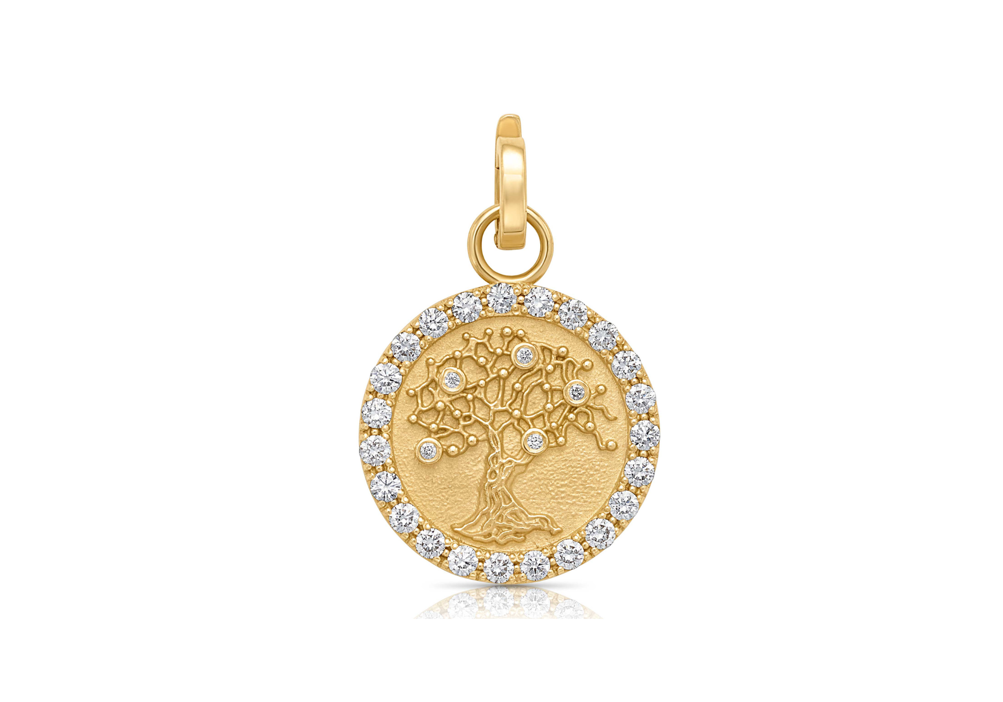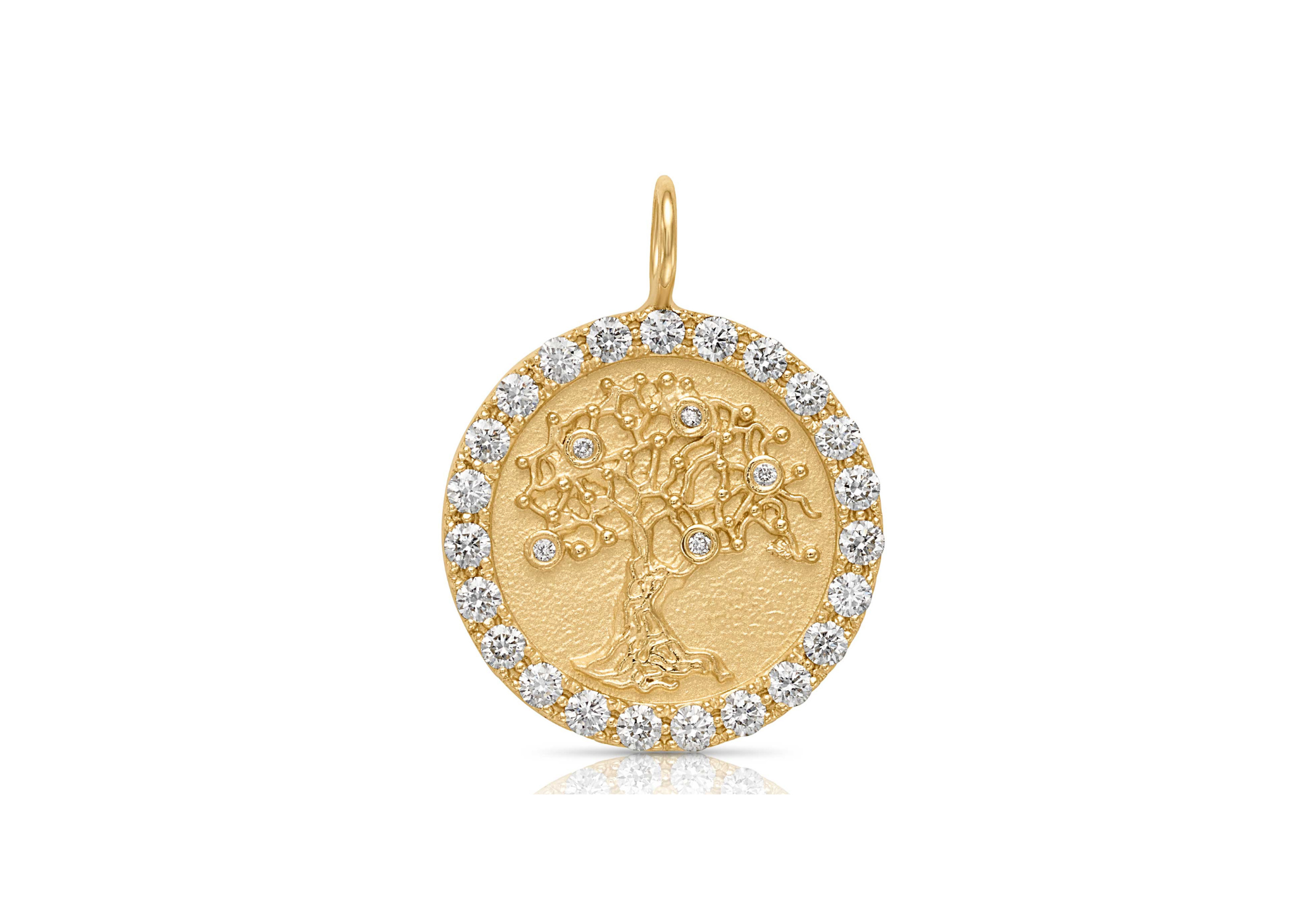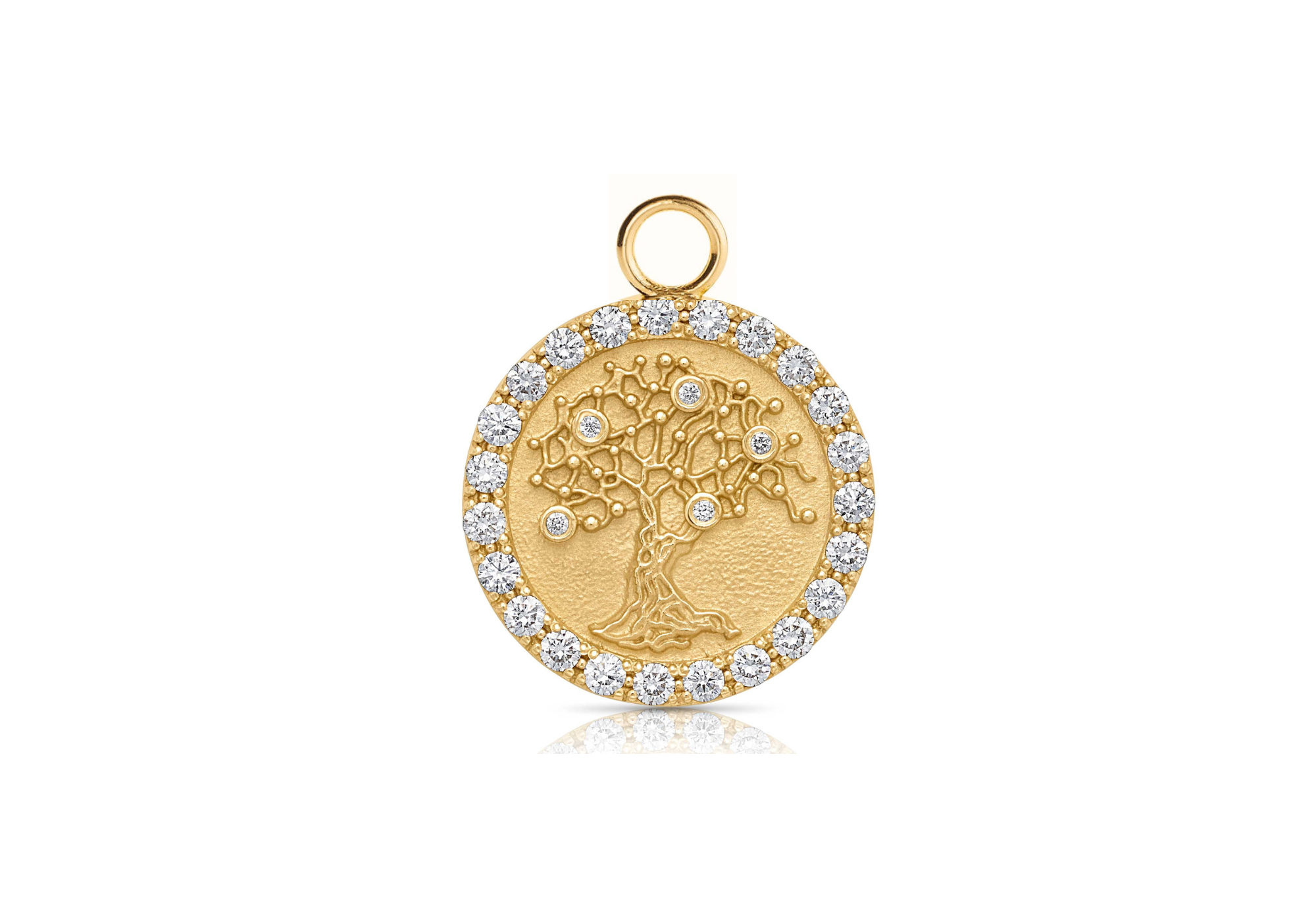 The charm comes with an open circle, or "o-ring" at the top of it. In this position, a separate bale is needed to attach the charm to a chain.