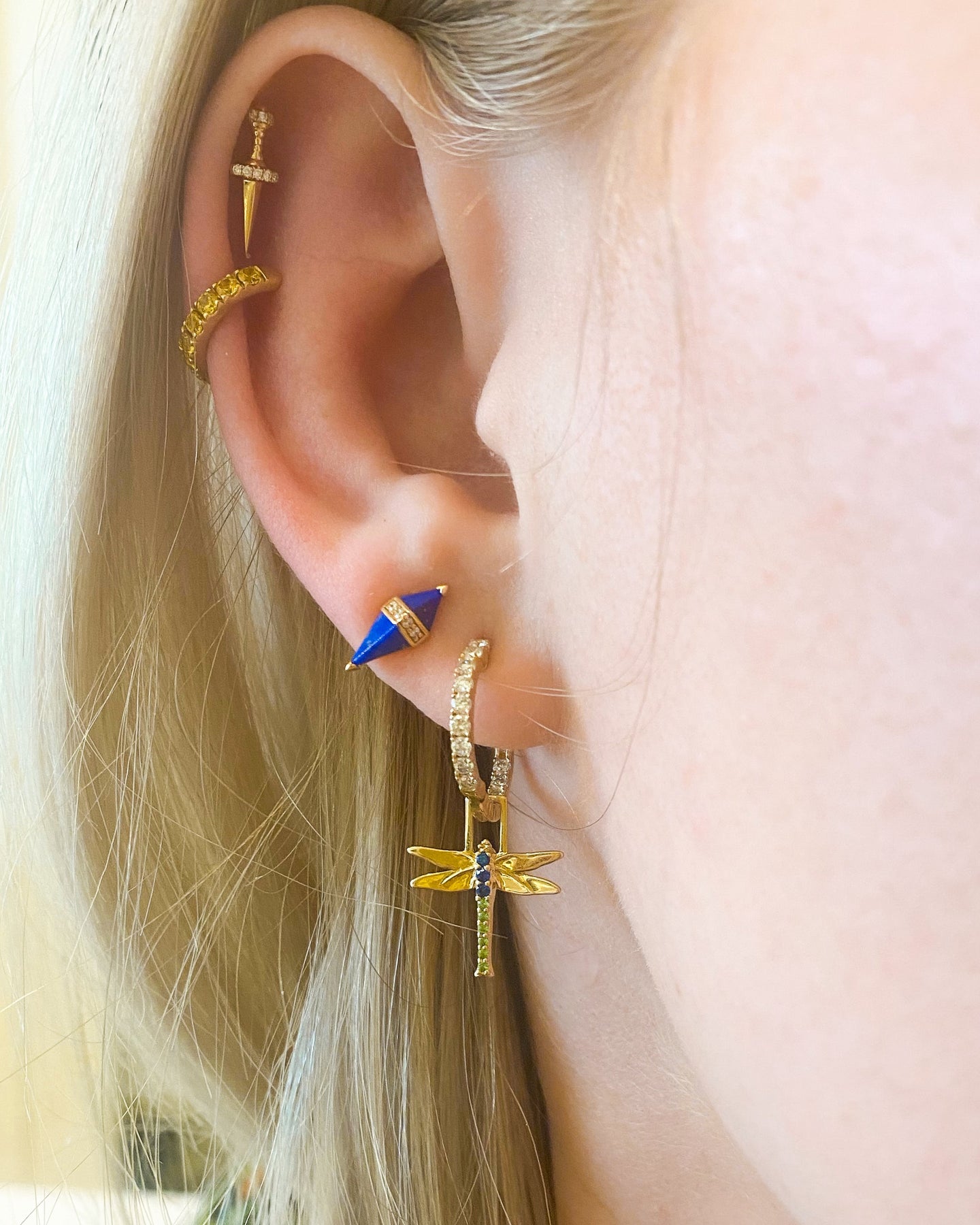 Add a touch of mature elegance to your ears with our Single Dragonfly Earwish set. Adorned with mesmerizing tsavorites and blue sapphires set in 14K yellow gold, this unique piece represents adaptability and grace.